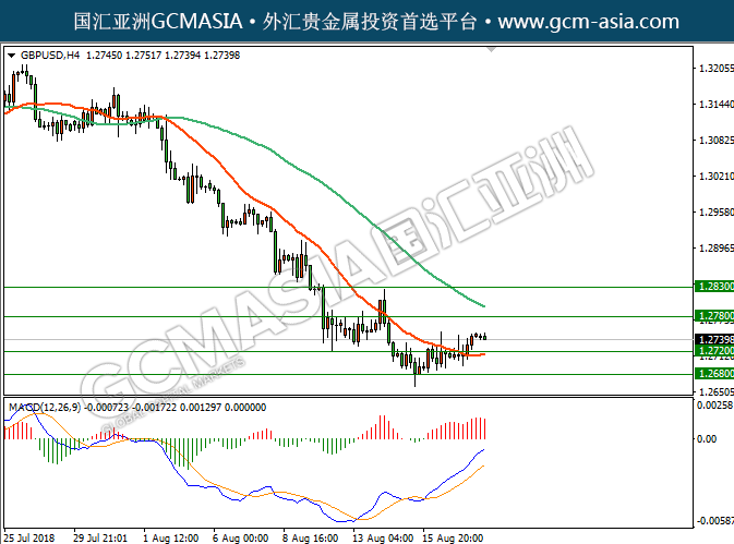 - GBPUSD H4:镑美整体运行在底部进而震荡。目前亦观望为主。MACD底部形成金叉,动能略有减弱。上方关注1.2780的压力和1.2830压力,下方关注1.2680支撑和1.2720的支撑。