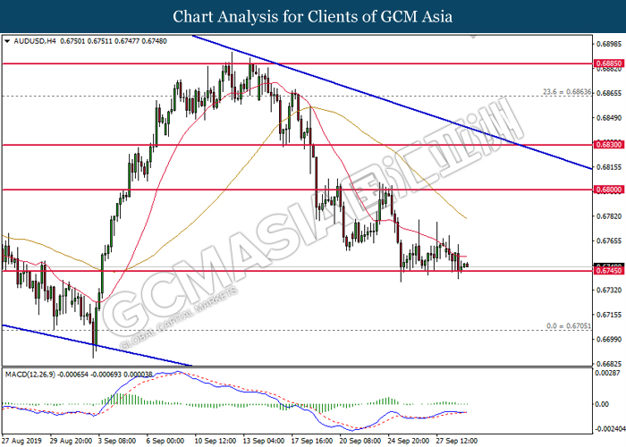 AUDUSD, H4: AUDUSD telah didagang dengan lebih rendah sementara kini menguji di tahap sokongan 0.6745. MACD yang memaparkan penyusutan pada momentum menaik mencadangkan pasangan ini untuk menurun dengan lebih lanjut selepas pemecahan berlaku di tahap tersebut.