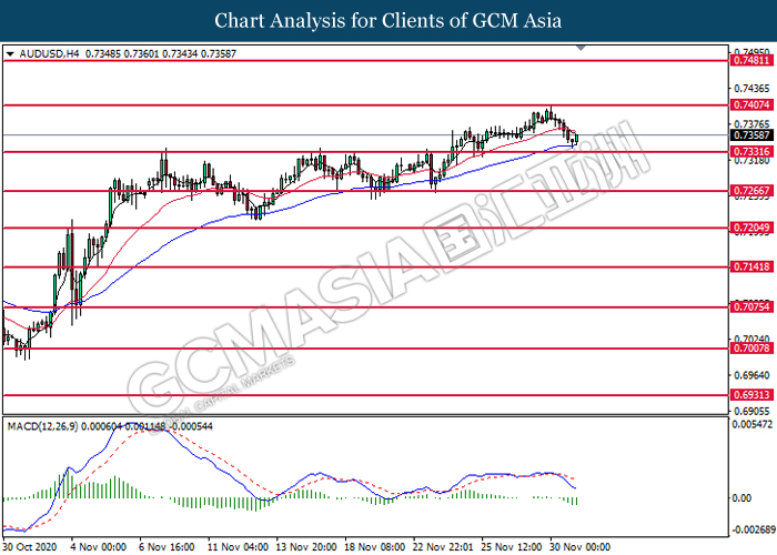 AUDUSD, H4: AUDUSD telah didagang dengan lebih tinggi selepas ia melantun dari tahap sokongan di 0.7330. MACD yang memaparkan isyarat bearish yang berterusan mencadangkan pasangan ini untuk didagang dengan lebih rendah dan menuju ke arah tahap sokongan di 0.7330.