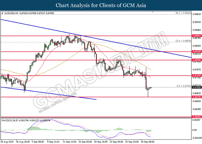 AUDUSD, H4: AUDUSD telah didagang dengan lebih tinggi sementara kini menguji di tahap rintangan 0.6705. MACD yang memaparkan penyusutan pada momentum menurun mencadangkan pasangan ini untuk didagang dengan lebih tinggi bagi jangka pendek selepas pemecahan berlaku di 0.6705.