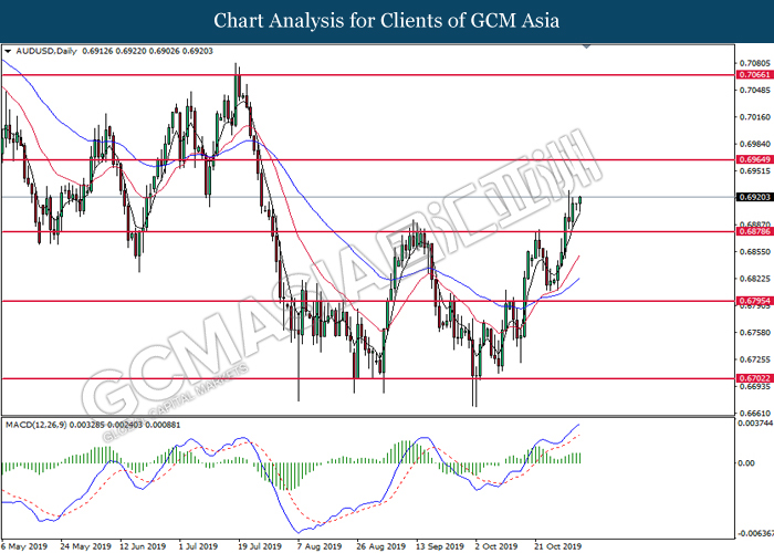 AUDUSD, Daily: AUDUSD telah didagang dengan lebih tinggi selepas ia memecah tahap rintangan sebelumnya pada 0.6880. MACD yang memaparkan momentum bullish mencadangkan pasangan ini untuk melanjutkan keuntungannya ke arah tahap rintangan 0.6965.