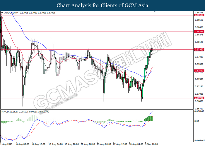 AUDUSD, H4: AUDUSD telah didagang dengan lebih tinggi sementara kini menguji di tahap rintangan 0.6795. Namun, MACD yang memaparkan penyusutan pada momentum bullish mencadangkan harganya untuk didagang dengan lebih rendah bagi jangka pendek sebagai pembetulan teknikal ke arah 0.6750.
