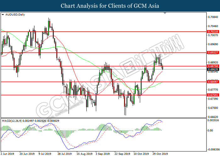 AUDUSD, Daily: AUDUSD telah didagang dengan lebih rendah selepas ia memecah tahap sokongan terdahulu 0.6875. MACD yang memaparkan momentum bullish yang berkurangan mencadangkan pasangan ini untuk melanjutkan kerugiannya ke arah tahap sokongan 0.6810.