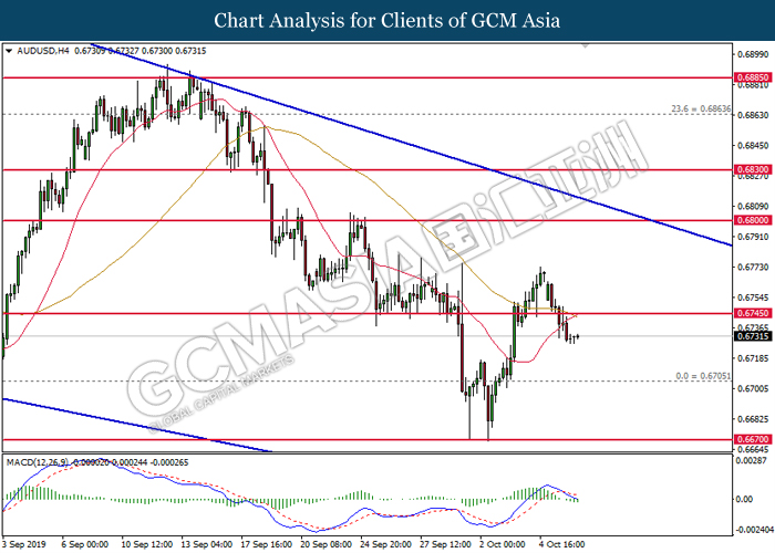 AUDUSD, H4: AUDUSD telah didagang dengan lebih rendah selepas ia memecahkan 0.6745. MACD yang memaparkan isyarat bearish mencadangkan pasangan ini untuk menurun selanjutnya dan menuju ke arah 0.6705.
