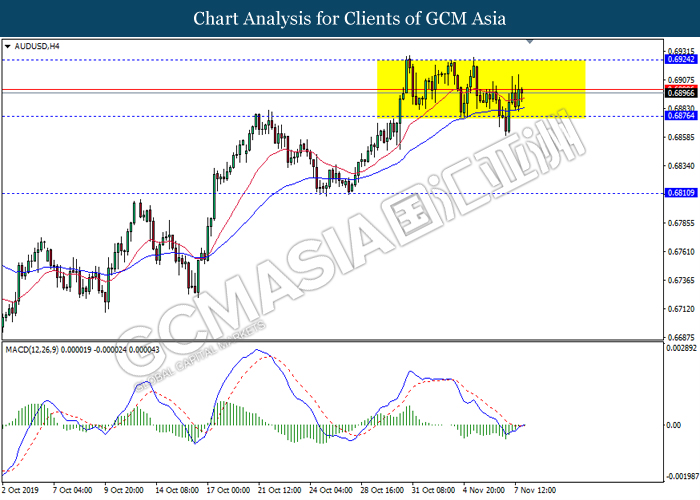 AUDUSD, H4: AUDUSD kekal didagang dalam saluran sisi susulan dengan lantunan dari tahap sokongan baru-baru ini. Namun, MACD yang memaparkan isyarat bias bullish dengan permulaan formasi silang emas mencadangkan pasangan ini untuk melanjutkan lantunannya dalam jangka pendek ke arah tahap rintangan 0.6925.