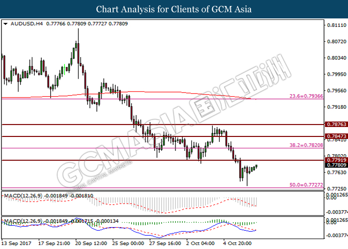 AUDUSD, H4: AUDUSD telah didagang dengan lebih tinggi selepas ia melantun dari tahap sokongan di 0.7730. Pembentukan candlestick pin bar dan silang keemasan yang dibentuk oleh garisan isyarat MACD memberi cadangan kepada pasangan tersebut untuk mengalami pembetulan teknikal secara jangka masa yang pendek dan berdagang dengan lebih tinggi ke arah tahap rintangan di 0.7790.
