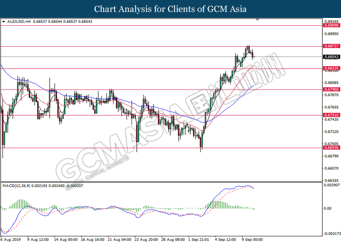 AUDUSD, H4: AUDUSD telah didagang dengan lebih rendah berikutan dengan penguduran dari tahap rintangan sebelumnya 0.6875. MACD yang memaparkan momentum bearish dengan formasi silang mati mencadangkan pasangan ini untuk menlanjutkan kerugiannya ke arah tahap sokongan 0.6835.