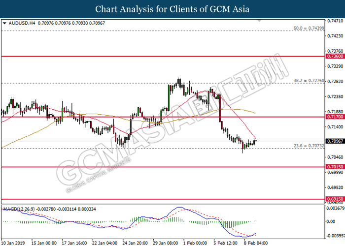 AUDUSD, H4: AUDUSD telah didagang dengan lebih tinggi selepas ia melantun dari tahap sokongan 0.7070. MACD yang mula untuk membentuk corak silang emas mencadangkan pasangan ini untuk meneruskan keuntungannya selepas ia menutup niaga di atas garisan 20-MA (merah).