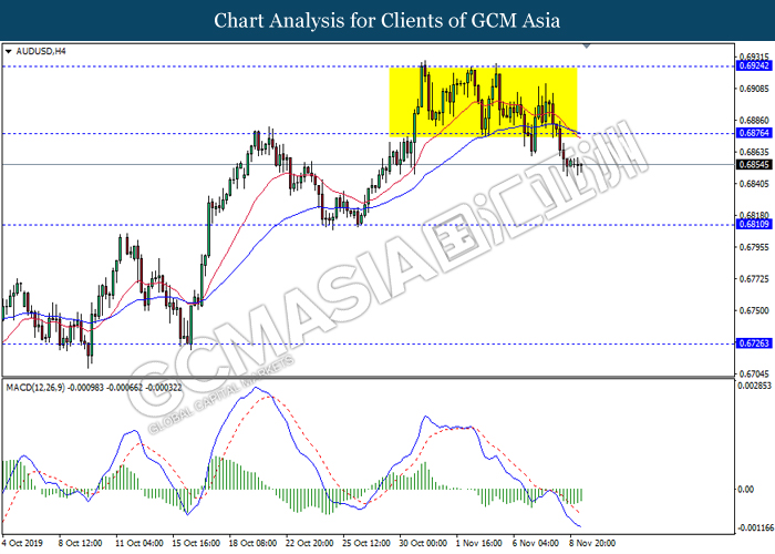 AUDUSD, H4: AUDUSD telah didagang dengan rata selepas pemecahan pada tahap sokongan sebelumnya 0.6875. Namun, MACD yang memaparkan isyarat momentum bearish yang telah berkurangan mencadangkan pasangan ini untuk mengalami pembetulan teknikal jangka pendek ke arah tahap rintangan terkini 0.6875.