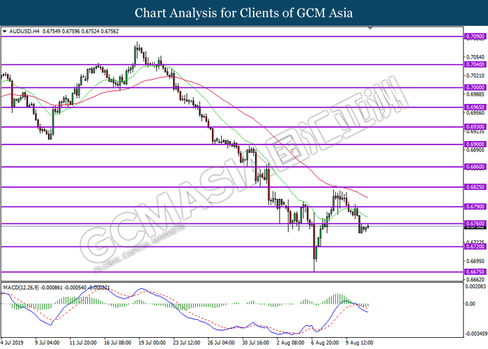 AUDUSD, H4: AUDUSD telah didagang dengan lebih rendah berikutan dengan pemecahan dari tahap sokongan sebelumnya di 0.6760. MACD yang memaparkan isyarat bias bearish dengan formasi silang kematian mencadangkan pasangan ini untuk melanjutkan kerugiannya ke arah tahap sokongan 0.6720.