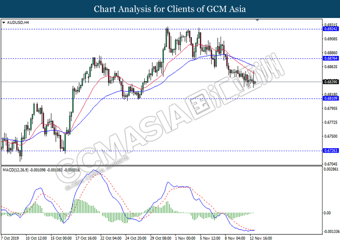 AUDUSD, H4: AUDUSD telah didagang dengan lebih rendah berikutan dengan pemecahan pada tahap sokongan sebelumnya 0.6875. Namun, MACD yang memaparkan isyarat bias bearish yang berkurangan dengan permulaan formasi silang emas mencadangkan pasangan ini untuk mengalami pembetulan teknikal jangka pendek ke arah tahap rintangan 0.6875.