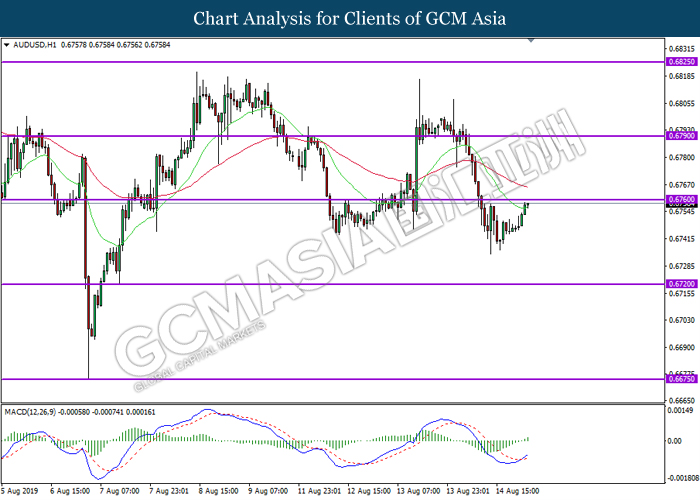 AUDUSD, H1: AUDUSD telah didagang dengan lebih tinggi sementara menguji berdekatan tahap rintangan 0.6760. MACD yang menunjukkan momentum bullish dengan formasi silang emas mencadangkan pasangan ini untuk melanjutkan keuntungannya selepas ia berjaya untuk memecahkan pada tahap rintangan tersebut.