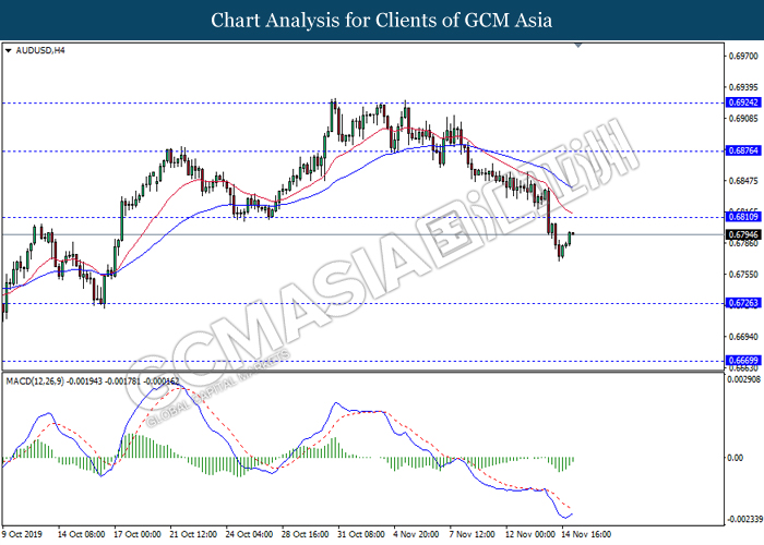 AUDUSD, H4: AUDUSD telah didagang dengan lebih tinggi berikutan dengan lantunan dari paras rendahnya. MACD yang memaparkan isyarat momentum bearish yang telah berkurangan mencadangkan pasangan ini untuk melanjutkan lantunannya ke arah tahap rintangan 0.6810.