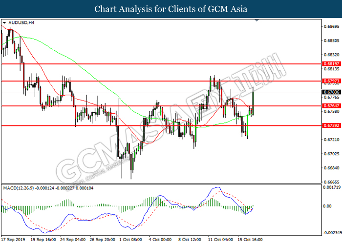 AUDUSD, H4: AUDUSD telah didagang dengan lebih tinggi selepas ia memecah tahap rintangan terdahulu 0.6765. MACD yang memaparkan momentum bearish yang berkurangan mencadangkan pasangan ini untuk melanjutkan keuntungannya ke arah tahap rintangan 0.6795.