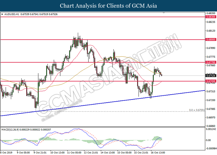 AUDUSD, H1: AUDUSD telah didagang dengan lebih rendah selepas ia berundur dari paras atas. MACD yang memaparkan penyusutan pada momentum menaik mencadangkan pasangan ini untuk didagang dengan lebih rendah dan menuju ke arah 0.6745.