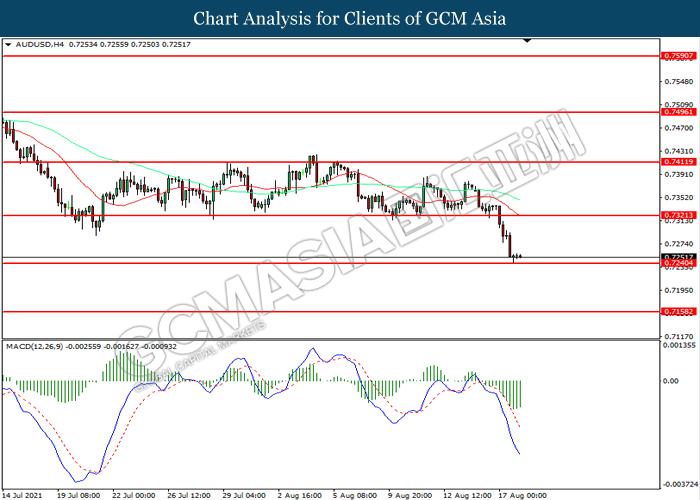 AUDUSD, H4: AUDUSD telah didagang dengan lebih rendah sementara kini berhampiran dengan tahap sokongan 0.7240.. MACD yang memaparkan momentum bearish mencadangkan pasangan ini untuk melanjutkan kerugiannya selepas ia memecah tahap sokongan tersebut.