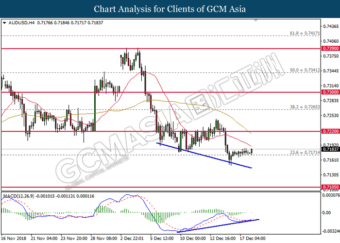 AUDUSD, H4: AUDUSD telah didagang dengan lebih tinggi selepas ia melantun dari tahap sokongan 0.7170. MACD yang mula untuk membentuk isyarat positive divergence mencadangkan pasangan ini untuk meningkat selanjutnya bagi jangka pendek selepas ia menutup di atas garisan 20-MA (merah).