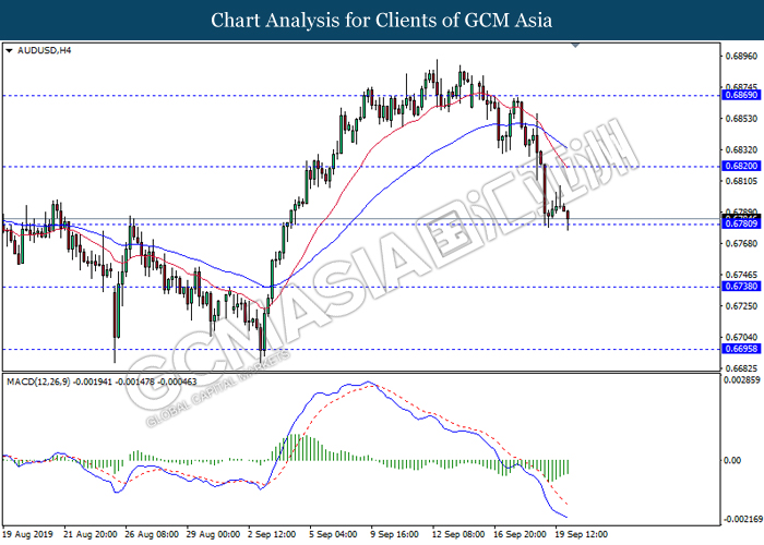 AUDUSD, H4: AUDUSD telah didagang dengan lebih rendah sementara ia sedang menguji tahap sokongan 0.6780. Namun, MACD yang memaparkan isyarat momentum bearish yang telah berkurangan mencadangkan pasangan ini untuk mengalami pembetulan teknikal jangka pendek ke arah tahap rintangan 0.6820.