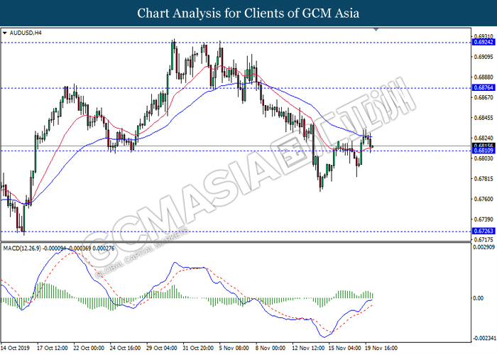 AUDUSD, H4: AUDUSD telah didagang dengan lebih rendah sementara ia sedang menguji berhampiran dengan tahap sokongan 0.6810. MACD yang memaparkan isyarat momentum bullish yang telah berkurangan mencadangkan pasangan ini untuk melanjutkan kerugiannya selepas ia memecah tahap sokongan tersebut.