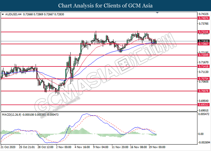 AUDUSD, H4: AUDUSD telah didagang dengan lebih tinggi selepas ia melantun dari tahap sokongan di 0.7265. MACD yang memaparkan isyarat momentum bearish yang berkurangan mencadangkan pasangan ini untuk melanjutkan keuntungannya dan menuju ke arah tahap rintangan di 0.7330.
