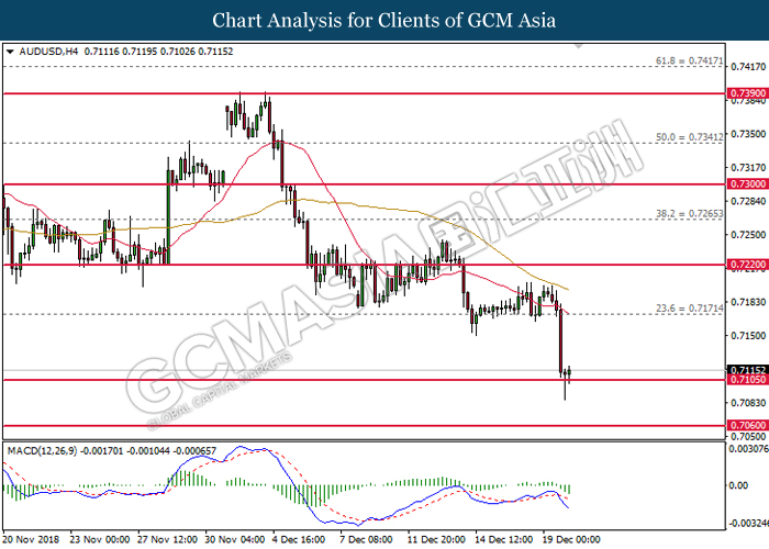 AUDUSD, H4: AUDUSD telah didagang dengan lebih rendah selepas ia memecahkan tahap sokongan di 0.7170. MACD yang telah membentuk isyarat bearish mencadangkan pasangan ini untuk meneruskan kerugiannya selepas ia memecahkan tahap sokongan di 0.7105.