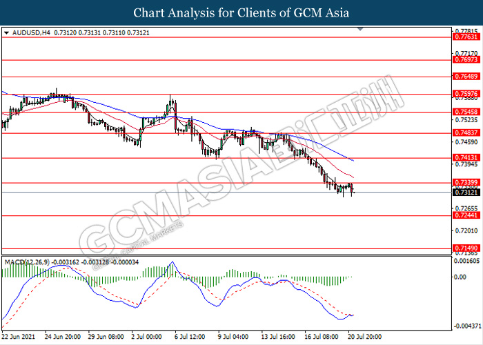 AUDUSD, H4: AUDUSD telah didagang dengan lebih rendah susulan dengan pengunduran dari tahap rintangan 0.7340. MACD yang memaparkan isyarat momentum bearish yang berterusan mencadangkan pasangan ini untuk melanjutkan kerugiannya ke arah tahap sokongan 0.7245.