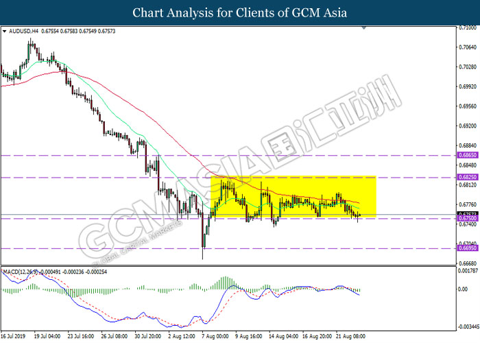 AUDUSD, H4: AUDUSD kekal didagang dalam saluran sisi sementara menguji pada paras bawah saluran tersebut berdekatan tahap sokongan 0.6750. MACD yang memaparkan momentum bearish mencadangkan pasangan ini untuk melanjutkan kerugiannya selepas ia berjaya untuk memecahkan pada tahap sokongan tersebut.