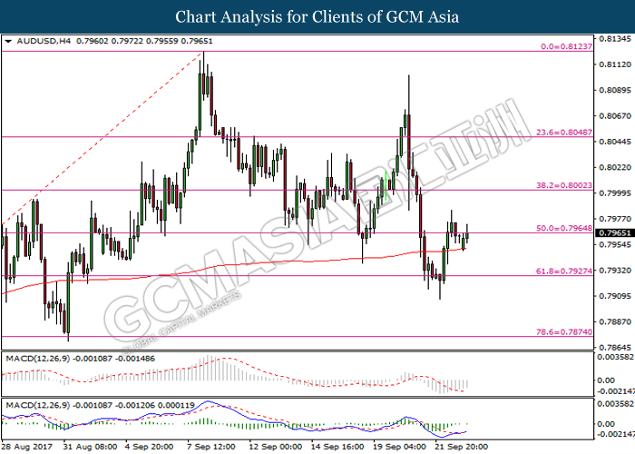 AUDUSD, H4: AUDUSD telah didagang dengan lebih tinggi selepas memecahkan tahap rintangan di 0.7930 dan rintangan pada garisan 200-MA. Pasangan tersebut kini sedang menguji tahap rintangan di 0.7965. Silang emas yang dibentuk oleh garisan isyarat MACD memberi cadangan kepada AUDUSD untuk melanjutkan momentum untuk berdagang dengan lebih tinggi sekiranya ia berjaya memecahkan tahap rintangan tersebut.