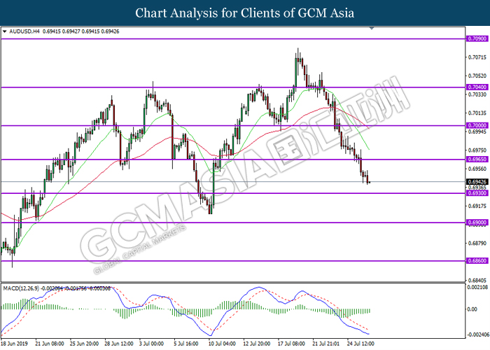 AUDUSD, H4: AUDUSD telah didagang dengan lebih rendah berikutan dengan pemecahan dari tahap sokongan sebelumnya di 0.6965. MACD yang memaparkan momentum bearish mencadangkan pasangan ini untuk melanjutkan kerugiannya ke arah tahap sokongan 0.6930.