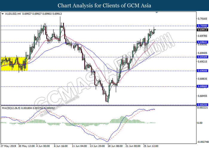 AUDUSD, H4: AUDUSD telah didagang dengan lebih tinggi sementara ia sedang menguji tahap rintangan 0.7000. Namun, MACD yang memaparkan momentum bullish yang telah berkurangan mencadangkan pasangan ini untuk didagang dengan lebih rendah sebagai pembetulan teknikal jangka pendek ke arah tahap sokongan 0.6965.