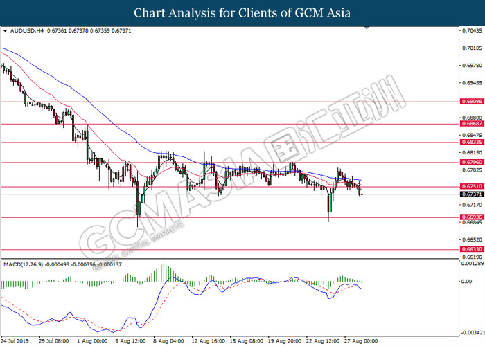 AUDUSD, H4: AUDUSD telah didagang dengan lebih rendah sementara kini menguji di tahap sokongan 0.6750. MACD yang memaparkan isyarat menurun mencadangkan pasangan ini untuk meneruskan kerugiannya dan menuju ke arah 0. 6695.