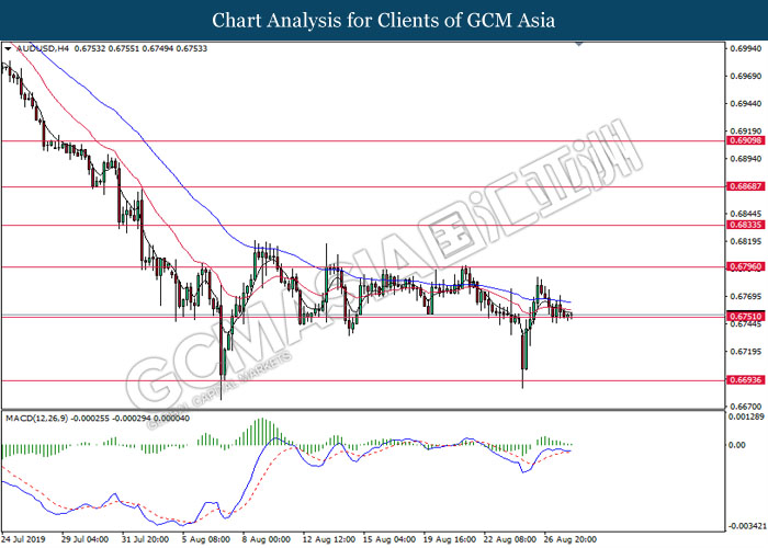 AUDUSD, H4: AUDUSD telah didagang dengan lebih rendah sementara kini menguji di tahap sokongan 0.6750. MACD yang memaparkan penyusutan pada momentum bullish mencadangkan pasangan ini untuk meneruskan kerugiannya selepas pemecahan berlaku di 0.6750.