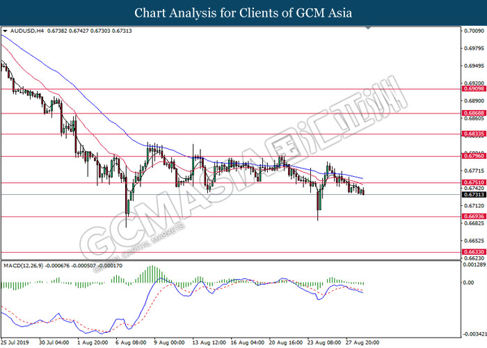 AUDUSD, H4: AUDUSD telah didagang dengan lebih rendah selepas ia memecahkan tahap sokongan di 0.6750. MACD yang memaparkan bias bearish mencadangkan pasangan ini untuk meneruskan kerugiannya dan menuju ke arah 0.6695.