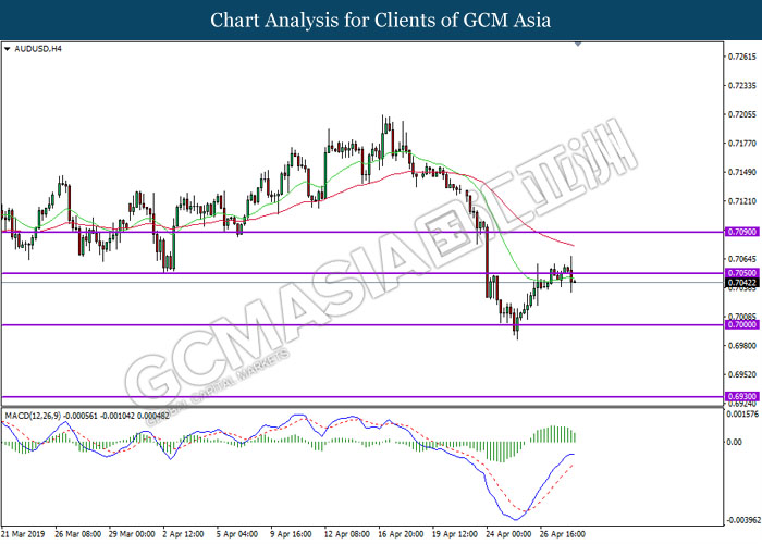 AUDUSD, H4: AUDUSD telah didagang dengan lebih rendah berikutan dengan pengunduran dari tahap rintangan di 0.7050. MACD yang memaparkan momentum bullish yang berkurangan mencadangkan pasangan ini untuk melanjutkan pengundurannya ke arah tahap sokongan di 0.7000.