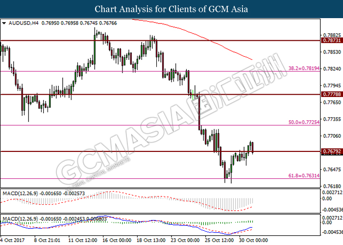 AUDUSD, H4: AUDUSD telah didagang dengan lebih tinggi setelah memecah tahap rintangan di 0.7680. Pasangan tersebut kini menguji balik paras tersebut yang kini dijadi sebagai tahap sokongan. Kejayaan untuk mengekal posisi di atas tahap sokongan akan memberi indikasi yang selanjutnya kepada pasangan tersebut untuk melanjutkan keuntungan ke arah tahap rintangan di 0.7725.
