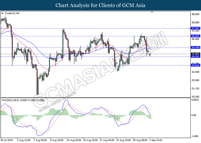 CrudeOIL, H4: Harga minyak mentah telah didagang dengan lebih rendah sementara ia sedang menguji berhampiran dengan tahap sokongan 54.50. MACD yang memaparkan isyarat momentum bearish mencadangkan komoditi ini untuk melanjutkan kerugiannya selepas ia memecah tahap sokongan tersebut.