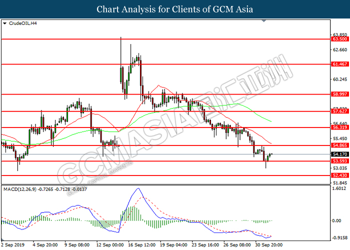 CrudeOIL, H4: Harga minyak mentah telah didagang dengan lebih tinggi selepas ia melantun dari tahap sokongan 53.60. MACD yang memaparkan momentum bearish yang berkurangan mencadangkan komoditi ini untuk melanjutkan keuntungannya ke arah tahap rintangan 54.85.