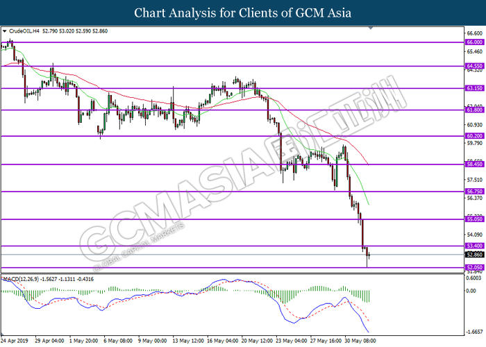 CrudeOIL, H4: Harga minyak mentah telah didagang dengan lebih rendah selepas ia memecahkan pada tahap sokongan sebelumnya di 53.40. MACD yang menunjukkan momentum bearish yang berterusan mencadangkan komoditi ini untuk melanjutkan kerugiannya ke arah tahap sokongan di 52.05.