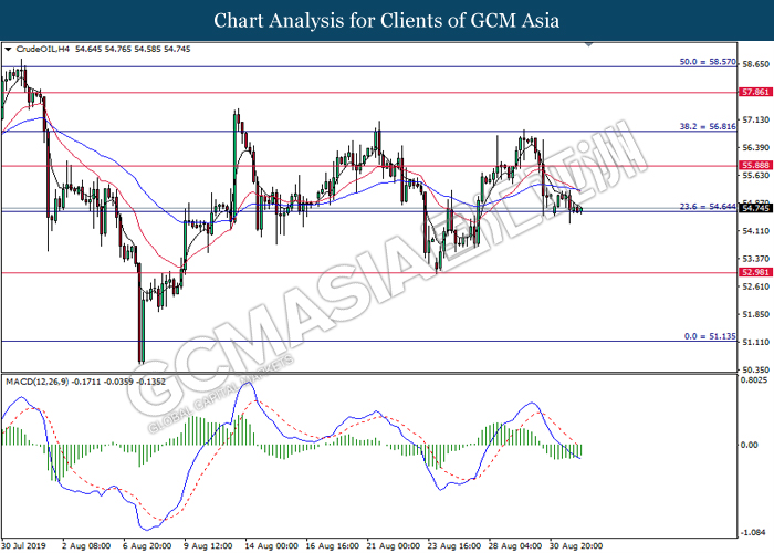 CrudeOIL, H4: Harga minyak mentah telah didagang dengan lebih rendah sementara kini menguji di tahap sokongan 54.65. Namun, MACD yang memaparkan penyusutan pada momentum bearish mencadangkan harganya untuk didagang dengan lebih tinggi bagi jangka pendek dan menuju ke arah 55.90.