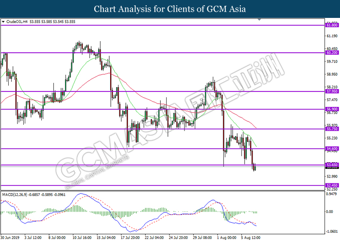 CrudeOIL, H4: Harga minyak mentah telah didagang dengan lebih rendah susulan dengan pemecahan dari tahap sokongan sebelumnya di 53.65. MACD yang menunjukkan momentum bearish mencadangkan komoditi ini untuk melanjutkan kerugiannya ke arah tahap sokongan 52.45.