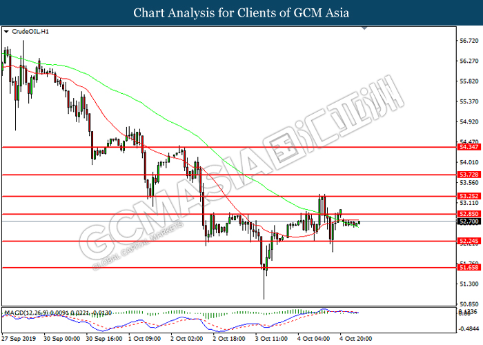 CrudeOIL, H1: Harga minyak mentah telah didagang dalam saluran sisi sementara ia menguji di tahap rintangan 52.85. Namun, MACD yang memaparkan momentum bearish yang berkurangan mencadangkan pasangan ini untuk mengalami pembetulan teknikal bagi jangka pendek.