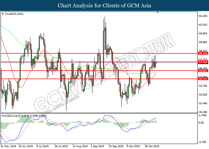 CrudeOIL, Daily: Harga minyak mentah telah didagang dengan lebih tinggi sementara kini menguji di tahap rintangan 57.00. Namun, MACD yang memaparkan momentum bullish yang berkurangan mencadangkan komoditi ini untuk mengalami pembetulan teknikal bagi jangka pendek.