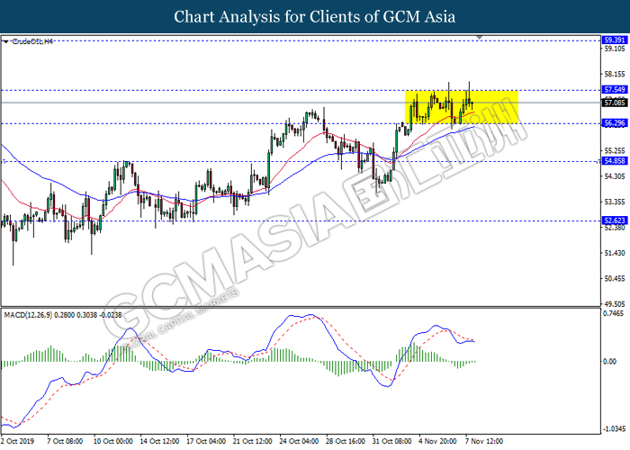 CrudeOIL, H4: Harga minyak mentah kekal didagang dalam saluran sisi susulan dengan pengunduran dari tahap rintangan 57.55 baru-baru ini. Namun, MACD yang memaparkan isyarat bias bearish mencadangkan komoditi ini untuk melanjutkan pengundurannya dalam jangka pendek ke arah tahap sokongan 56.30.
