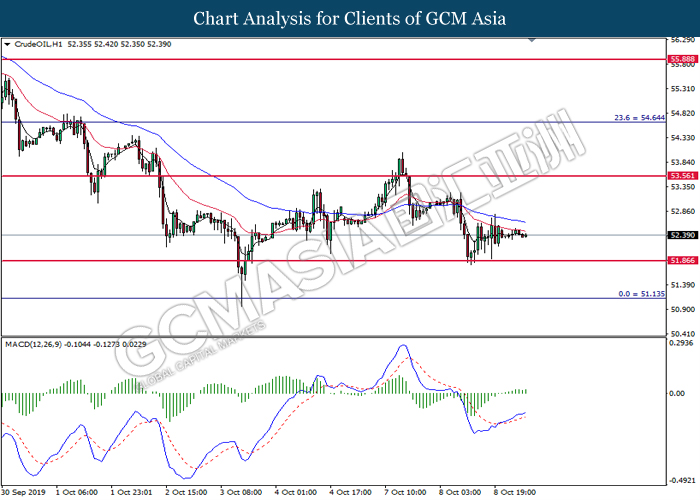CrudeOIL, H1: Harga minyak mentah telah didagang dengan lebih tinggi selepas ia melantun dari tahap sokongan 51.85. MACD yang memaparkan momentum bullish mencadangkan harganya untuk didagang dengan lebih tinggi dan menuju ke arah tahap rintangan 53.55.