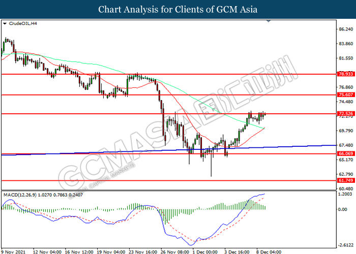 CrudeOIL, H4: Harga minyak mentah telah didagang dengan lebih tinggi sementara kini menguji di tahap rintangan 72.55. Namun, MACD yang memaparkan momentum bullish yang berkurangan mencadangkan komoditi ini untuk mengalami pembetulan teknikal bagi jangka pendek.