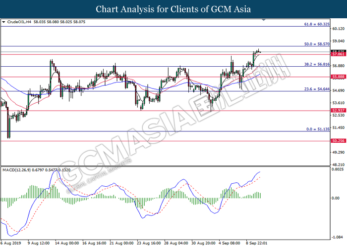 CrudeOIL, H4: Harga minyak mentah telah didagang dengan lebih tinggi selepas ia memecah tahap rintangan sebelumnya 57.85. Namun, MACD yang memaparkan momentum bullish yang berkurangan mencadangkan harganya untuk mengalami pembetulan teknical jangka pendek ke arah tahap sokongan 57.85.