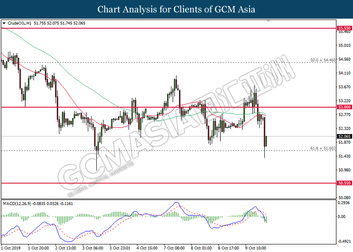 CrudeOIL, H1: Harga minyak mentah telah didagang dengan lebih rendah selepas ia berundur dari paras atasnya. MACD yang memaparkan isyarat bearish mencadangkan harganya untuk didagang dengan lebih rendah bagi jangka pendek.