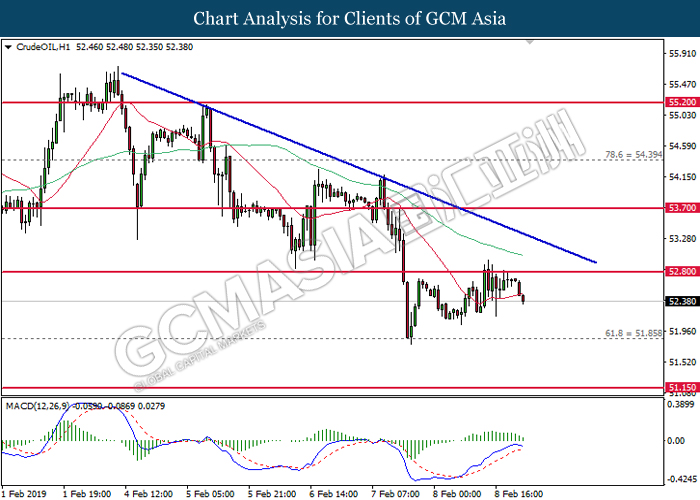 CrudeOIL, H1: Harga minyak mentah telah didagang dengan lebih rendah selepas ia berundur dari tahap rintangan 52.80. MACD yang memaparkan penyusutan pada momentum menaik mencadangkan harganya untuk didagang dengan lebih rendah dan menuju ke arah 51.85.