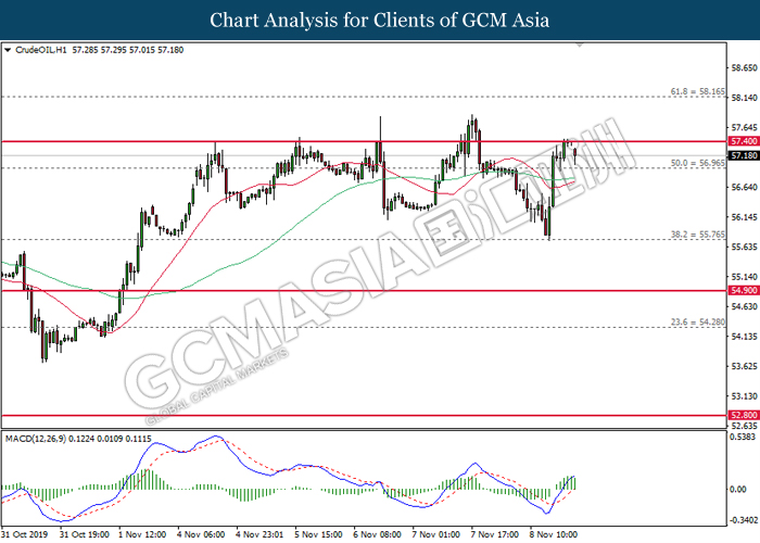 CrudeOIL, H1: Harga minyak mentah telah didagang dengan lebih rendah selepas ia berundur dari 57.40. MACD yang memaparkan penyusutan pada momentum menaik mencadangkan harganya untuk didagang dengan lebih rendah bagi jangka pendek.