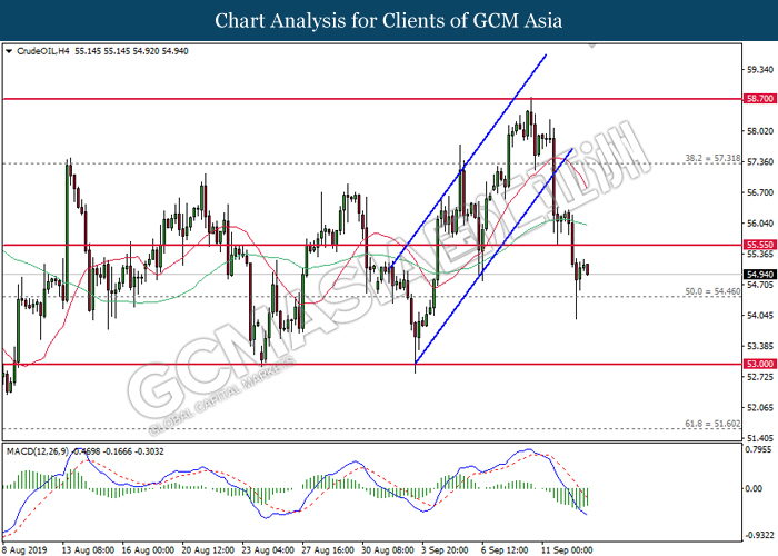 CrudeOIL, H4: Harga minyak mentah telah didagang dengan lebih rendah selepas ia memecahkan tahap sokongan di 55.55. MACD yang memaparkan isyarat bearish mencadangkan harganya untuk didagang dengan lebih rendah dan menuju ke arah 54.45.